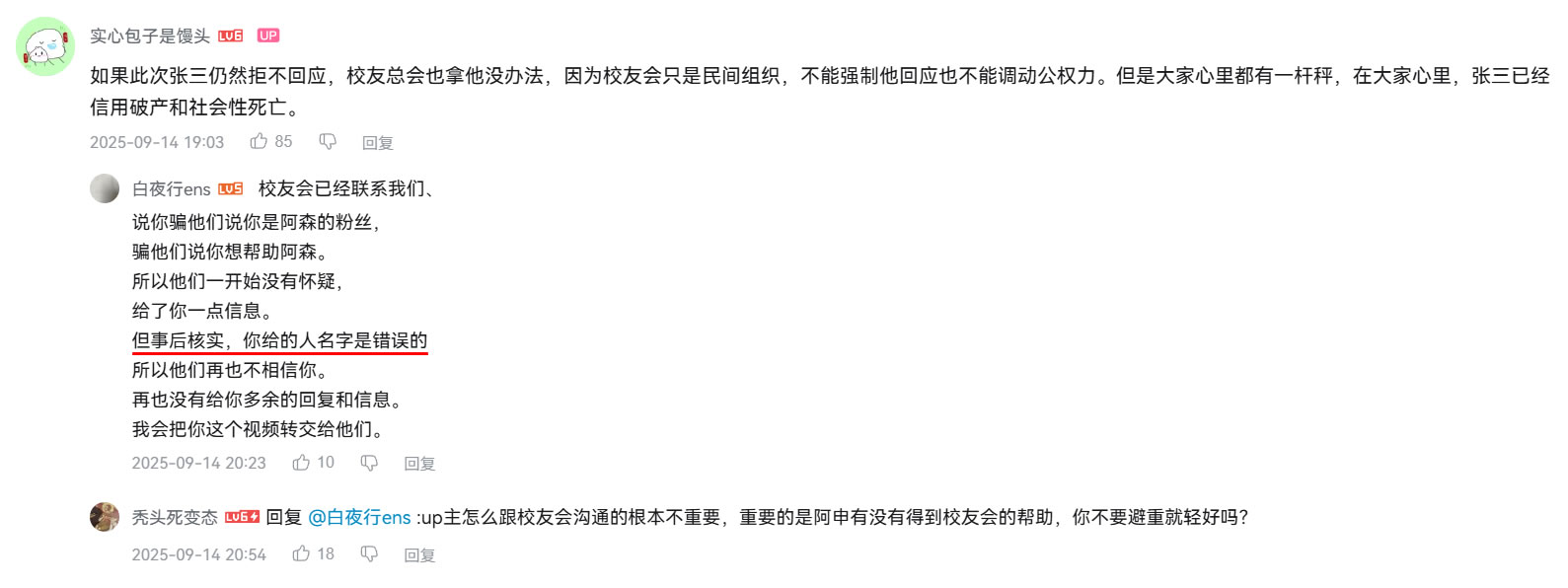 2025年9月14日,B站网友“实心包子是馒头”发布视频《[0156]复旦大学校友总会介入张三事件》称:已联系复旦大学校友总会,校友总会称向“空鼻狗”阿申发起救助。