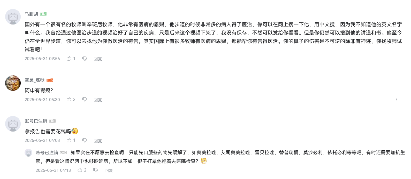 结论:所谓的“拒绝癌症治疗”、“希望癌症扩散”,只不过是阿申从最轻微的“萎缩性胃炎”放大而来,是他习惯性的卖惨。