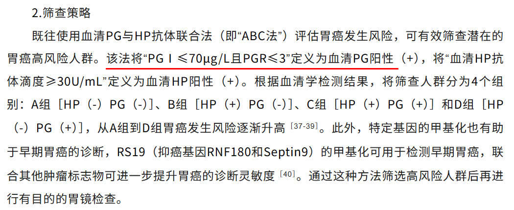 在《胃癌早诊早治中国专家共识》中指出,筛查胃癌高风险人群将“PGⅠ≤70μg/L且PGR≤3”定义为“血清PG阳性”。