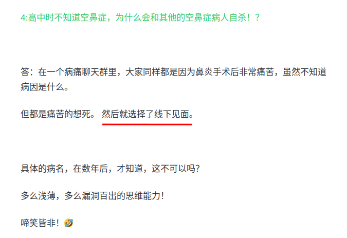 在一个病痛聊天群里,大家同样都是因为鼻炎手术后非常痛苦,虽然不知道病因是什么。