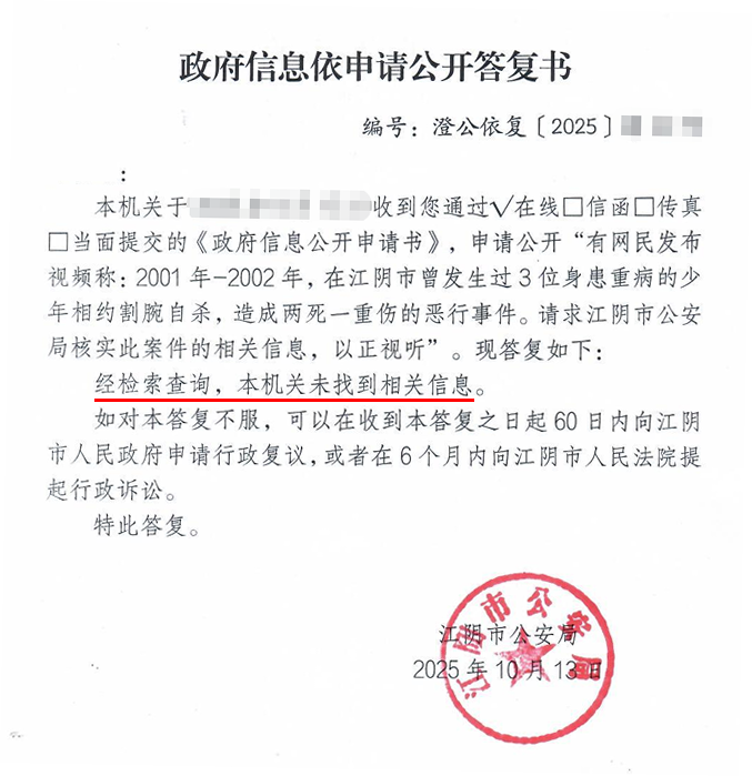 有网民发布视频称:2001年-2002年,在江阴市辖区曾发生过3位身患重病的少年相约割腕自杀,造成两死一重伤的恶性事件。请求江阴市公安局核实此案件的相关信息,以正视听。